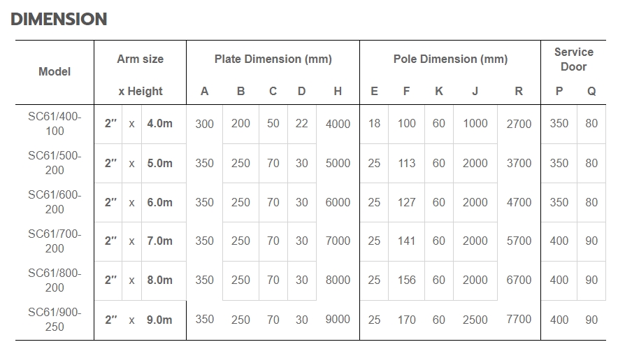 - ความสูงเสามีให้เลือกได้ตั้งแต่ 4-12 เมตร สูงสุดถึง 14เมตร